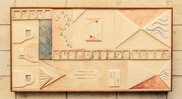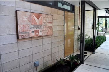 The design for these exterior panels, installed on a mid-century modern home, is inspired by the actual footprint of the home with each area represented by architectural or international symbols indicating its use. The paw prints tie the design together and are a personal expression of the owner’s pets and their paths through the home. The framing was made of Ipe wood to match the walkway.